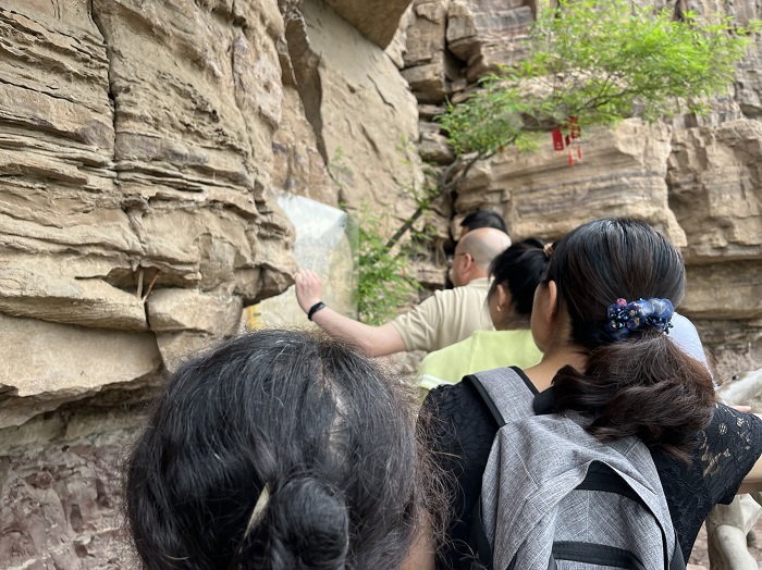 党员和教师代表还爬上了神工铺。那是一条位于虎口崖下的狭窄凹槽,宽不过一米,高不足2米,下临峭壁,很难想象如何住宿过夜,可当年修渠时由于附近村庄稀少,无处住宿,修渠农民就在这里风餐露宿,顶风冒雪,抗严寒,战酷暑,完成了这一艰巨的工程。大家亲手触摸着坚硬的山壁,近距离研读着当年修渠农民在山壁上写下的 “下定决心,不怕牺牲,排除万难,去争取胜利”,想到为这红旗渠苦干十载的7万人民和献出生命的81位群众,更加深刻地体会到了:“社会主义是拼出来的,是干出来的,是拿命换出来的”。