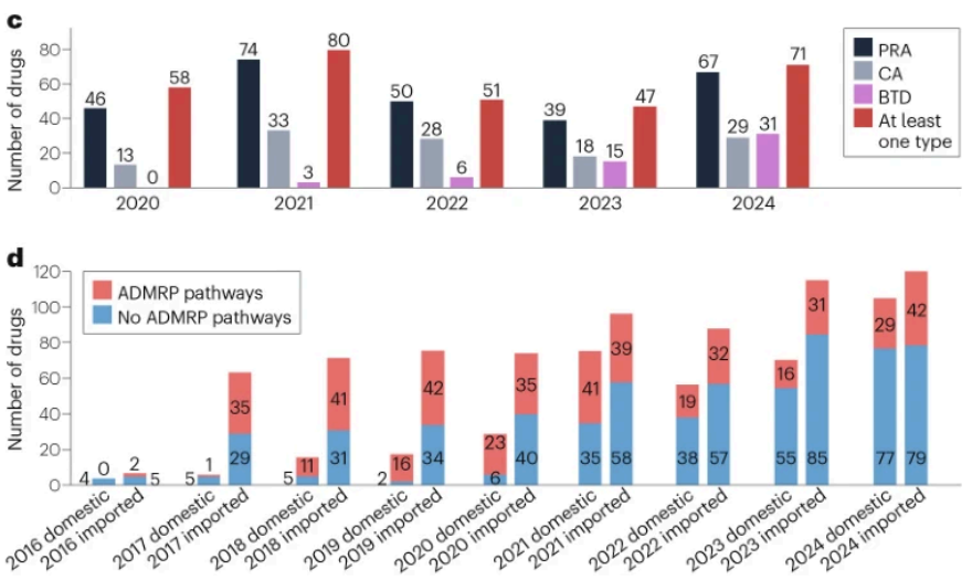 2016-2024年NMPA批准上市新药数量:a, 按药物类型分类; b, 按药物审评审批类型分类; c, 通过药品加快上市注册程序批准情况,“PRA”指优先审评审批、“CA”指附条件批准、“BTD”指突破性治疗药物、“At least one type”指通过至少一种药品加快上市注册程序批准上市的药物;d, 按药物来源分类。