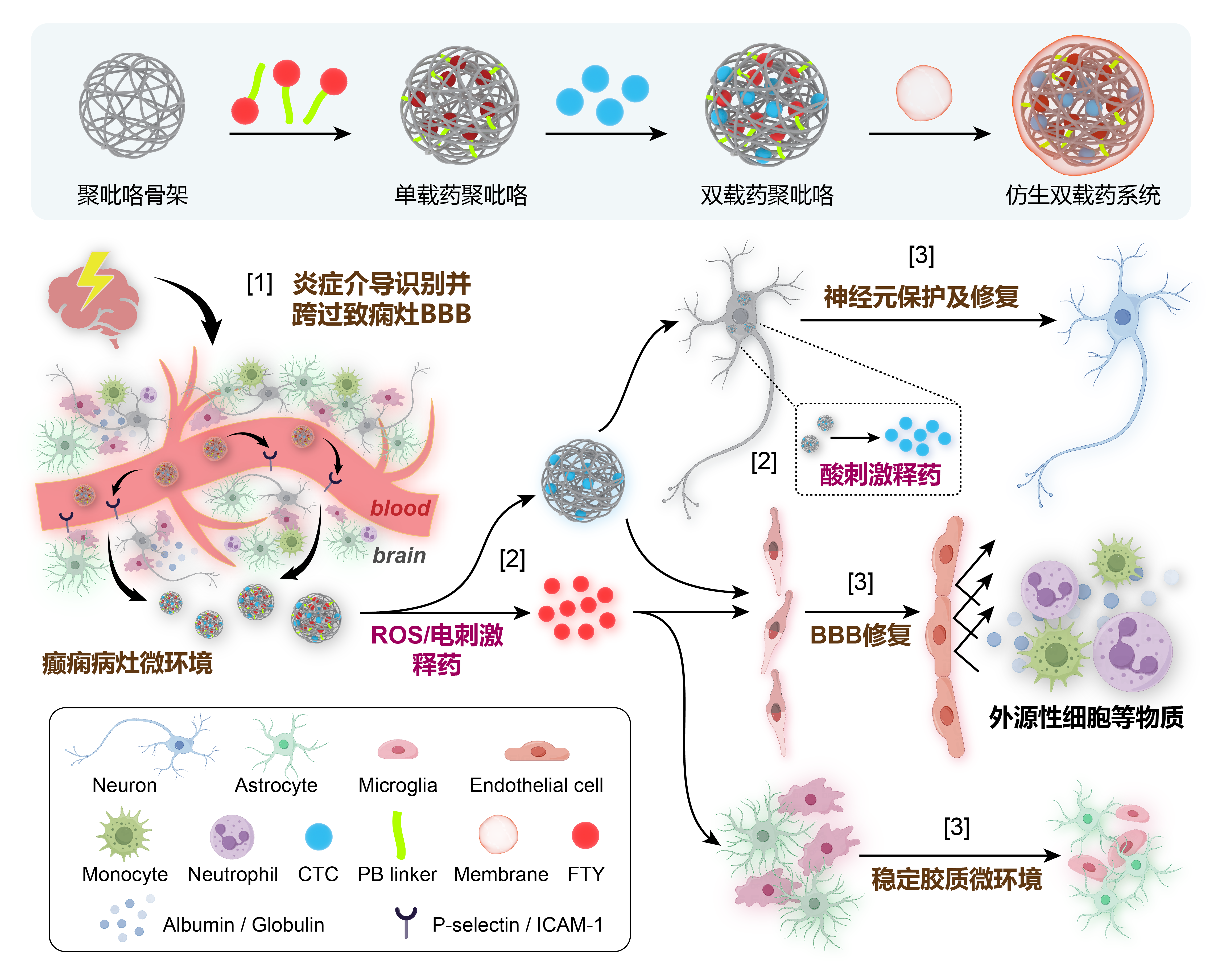 图1巨噬细胞膜仿生双载药聚吡咯系统的设计思路和治疗策略。[1]载药系统被巨噬细胞膜包裹后,能够在体内识别并结合炎症状态下的癫痫病灶血脑屏障,然后跨过血脑屏障进入病灶脑实质;[2]载药系统既能在胞外响应ROS和异常生物电刺激而加速释放芬戈莫德,又能被胞内溶酶体酸性环境刺激而释放胞磷胆碱钠;[3]载药系统一方面释放两种药物,另一方面能够清除病灶ROS,最终发挥保护和修复受损神经元、稳定胶质细胞微环境、恢复血脑屏障完整性的多重疗效。