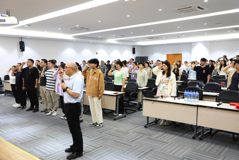 党委书记王建新、副书记王盛、组织委员王洋、“在党五十年”纪念章获得者张敖珍为师生预备党员代表佩戴党徽。王建新作为领誓人,带领全体党员面向党旗庄严宣誓,“我志愿加入中国共产党,拥护党的纲领,遵守党的章程……”,铿锵有力的誓言不仅回荡在会场内,更深深植根于每一位在场党员的心中。