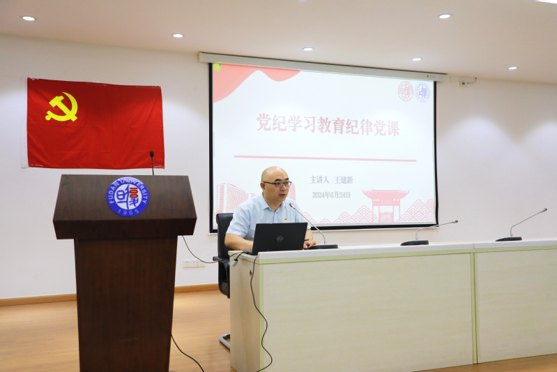 最后,王建新作党纪学习教育纪律党课。王书记从深刻认识开展党纪学习教育的重要意义入手,带领大家学习了习近平总书记关于全面加强党的纪律建设的重要论述。接下来围绕《中国共产党纪律处分条例》(以下简称《条例》)展开讲解,介绍了条例修订的背景和特点,重点解读“六大纪律”,并选取多个高校师生违反党纪典型案例,对师生开展了深刻的警示教育。王书记强调,党的纪律是管党治党的“戒尺”,是全党必须遵守的行为准则。希望广大师生党员干部以本次学习为契机,学纪知纪明纪守纪,自觉用“六大纪律”校正思想和行动,将党纪学习教育任务措施融入日常工作中,为推动学院高质量发展做出更大贡献。