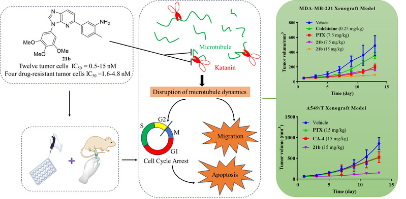 研究团队在前期工作的基础上,通过分区设计、表型筛选和逐步优化,获得了多个具有优秀抗肿瘤活性的化合物,随后通过成药性评价和深入的活性研究,最终发现了以化合物21b为代表的咪唑并[4,5-b]吡啶类新型Katanin/Tubulin双功能剂。作用机制研究表明,优选化合物21b对Katanin和Tubulin具有优异的双重靶向作用,能够破坏肿瘤细胞的微管网络、导致细胞G2/M周期阻滞进而诱导肿瘤细胞凋亡。21b还能够抑制体外集落形成和血管生成,并对12种肿瘤细胞株和4种耐药肿瘤细胞株具有强效的抗增殖作用(IC50 = 0.5-15 nM)。此外,21b还能够抑制肿瘤细胞迁移、下调转移相关蛋白的表达。急性毒性实验结果表明,21b的LD50值为150 mg/kg,具有较好的安全性。在裸鼠乳腺癌移植瘤模型中,21b在7.5和15 mg/kg剂量下显著抑制肿瘤生长并且没有表现出明显的毒副作用。在紫杉醇耐药的肺癌移植瘤模型中,21b克服了临床相关的紫杉醇耐药,展现出良好的安全性和优异的单药体内抗肿瘤效果,具有潜在的开发和应用前景。