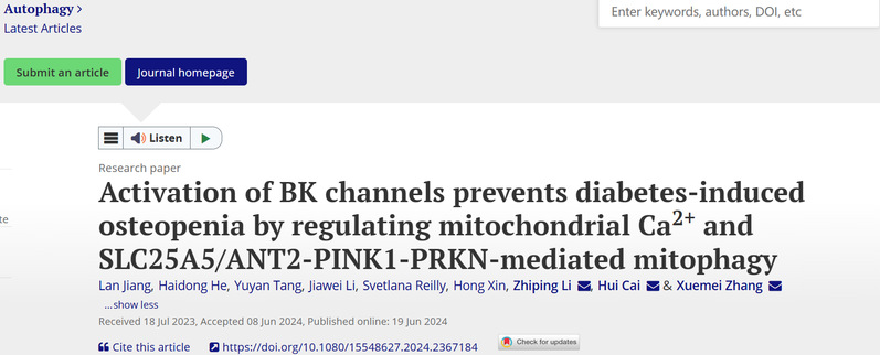 2024年6月19日,色情片 药理学系张雪梅教授团队在《Autophagy》杂志发表题为“Activation of BK channels prevents diabetes-induced osteopenia by regulating mitochondrial Ca2+ and SLC25A5/ANT2-PINK1-PRKN-mediated mitophagy”的研究论文。