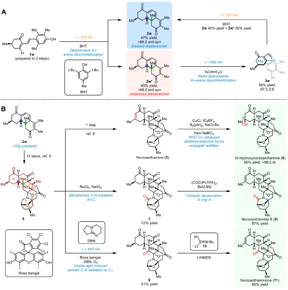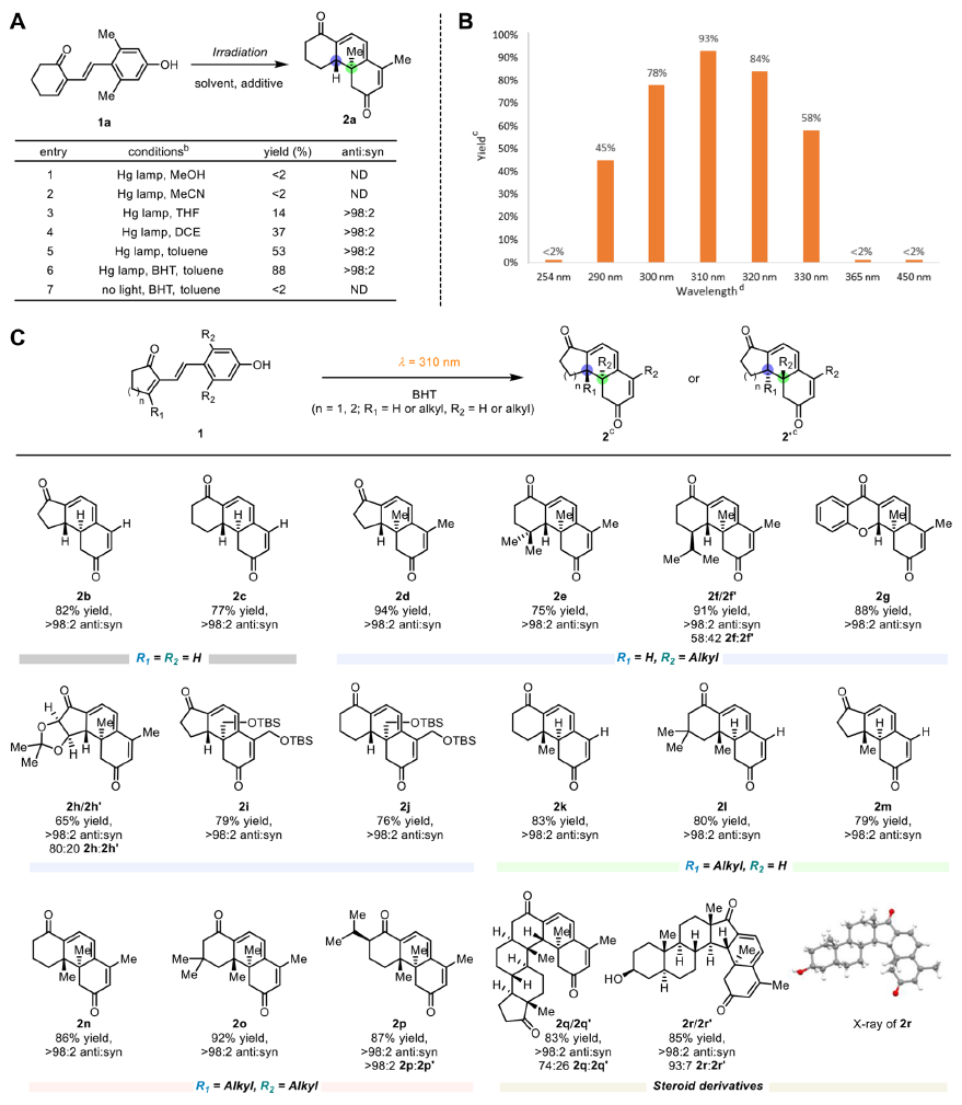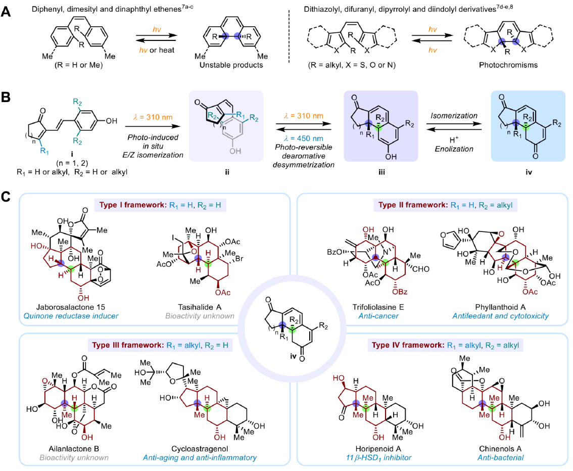 复杂多环天然产物因其丰富的生物活性成为药物研发的重要目标。在这些复杂分子的化学合成中,其核心骨架的高效构建通常是合成的关键难点。去芳构化的6π电环化反应有望成为高效构建多环骨架的重要方法,然而由于产物稳定性差等原因,该反应目前多用于光电材料等领域,其在复杂化合物合成方面的应用鲜有报道(图1A)。