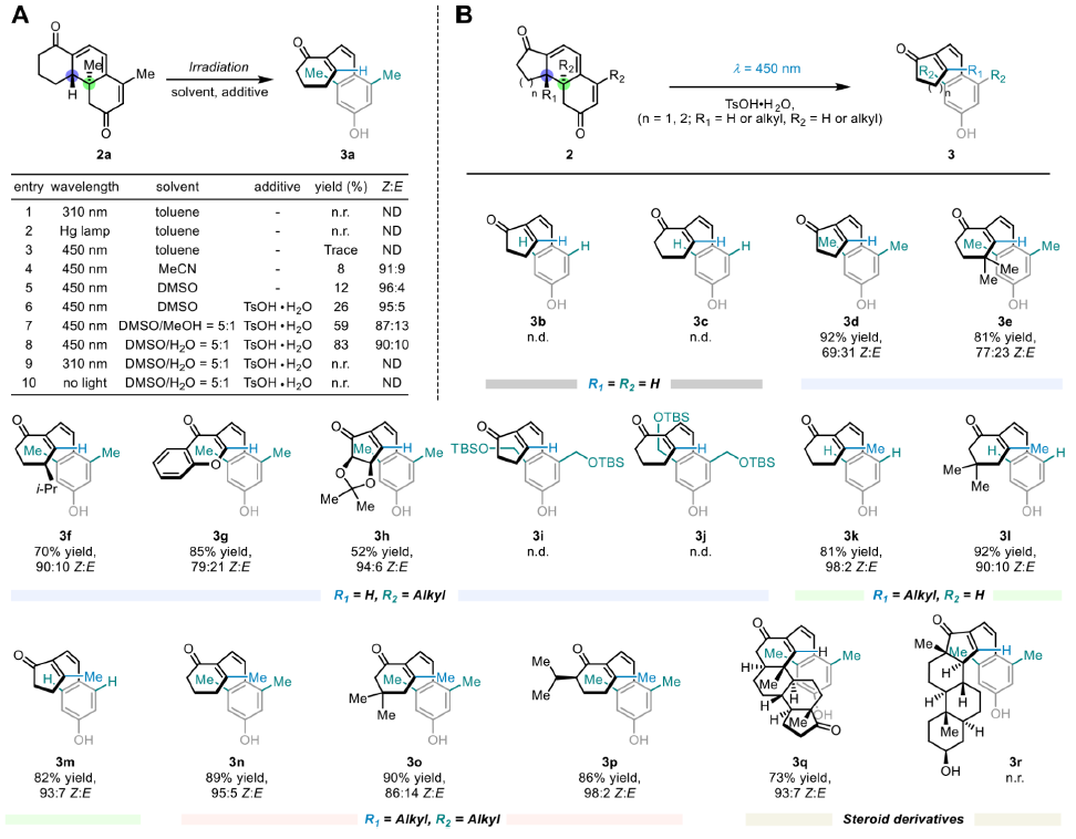 项目团队对逆向的去芳构化6π去对称化反应也开展了研究,成功实现了该反应过程(图3)。与310nm为最优波段、甲苯为最优溶剂的正向电环化反应条件不同,该反应的逆向过程以450nm可见光为最优波段,极性溶剂DMSO/H2O=5:1为最优溶剂,TsOH的加入可显著提高反应效率(图3A)。利用该过程,一系列电环化反应产物被逆向转化为顺式多烯前体3,部分化合物由于产物稳定性差(3b、3c)或对酸不耐受(3i、3j),未能实现该转化(图3B)。