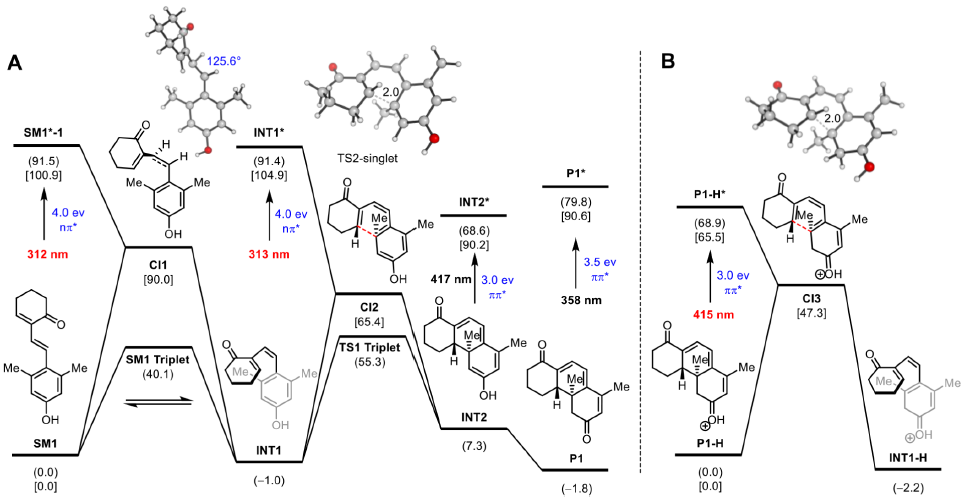理论方面,该光可逆反应在不同波长下方向逆转的机理同样引人关注。交通大学色情片 邹一可及UCLA Houk团队采用DFT方法对此进行了探究,证实该光可逆反应的方向由入射光波长与质子化状态协同调控(图6):高能紫外光(310 nm) 驱动正向反应,依次经 光致 E→Z异构化 与 光促 6π-电环化 生成热力学稳定产物 P1;低能可见光(450 nm) 在 酸辅助下 通过质子化物种 P1−H的吸收,驱动逆向 6π-电环开环,实现反应逆转。