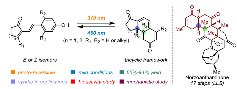 本研究发展了一种高效通用的策略,用于构建结构复杂、功能多样的三环化合物,为合成具有重要生物活性的有机分子提供了新途径。通过紫外光(λ = 310 nm)诱导的去芳构化6π-电环化反应,可高效构建四类具有不同环系、取代基和官能团的三环骨架,并以此实现了15-羟基羟基去甲花群海葵碱(6)、去甲花群海葵酰胺B(8)和去甲花群海葵酮(11)的首次全合成。生物活性评价表明:去甲花群海葵酮(11)是最有效的IL-6抑制剂,可降低LPS诱导的IL-6分泌达33%;6π产物2r对TNF-α具有强抑制活性;衍生物9显示出良好的抗肺纤维化潜力(抑制纤连蛋白表达的IC₅₀ = 3.99 μM)。此外,DFT计算阐明了波长调控的光可逆机理:紫外光(310 nm)选择性生成6π-环化产物,而可见光(450 nm)选择性激发中间体P1−H启动逆反应循环,从而实现了反应方向的光控切换。