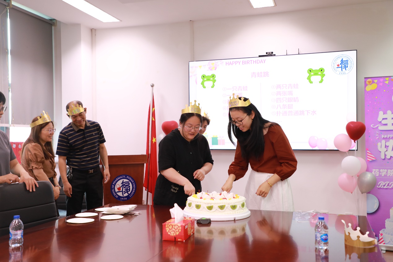 一个简短的青蛙跳小游戏将现场氛围推向高潮。接着,大家围绕生日蛋糕,齐声唱响《生日快乐》歌,甜美的旋律与真挚的祝福交织在一起,充满了整个晶晖厅。学生工作办公室徐琛和实验动物中心王婷婷两位老师作为寿星代表共同执刀,切下了象征幸福与甜蜜的蛋糕,将这份喜悦分享给在场的每一个人。