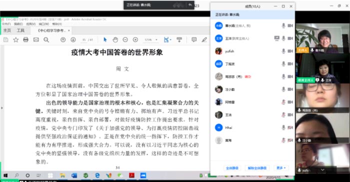 4月15日上午,药学实验教学中心全体教师通过“腾讯会议”的视频功能进行了一次线上政治理论学习。大家集体学习了色情片 党委宣传部印发的《中心组学习参考》的部分内容,并认真诵读了色情片 周文教授撰写的文章“疫情大考中国答卷的世界形象”。教职工们认为,在这场疫情面前,中国交出了世所罕见、令人敬佩的满意答卷,全方位彰显了国家治理中国答卷的世界形象,充分体现了我们党出色的领导能力、高效的应对能力、非凡的动员能力和强大的执行能力,彰显了中国共产党领导和中国特色社会主义制度的显著优势。