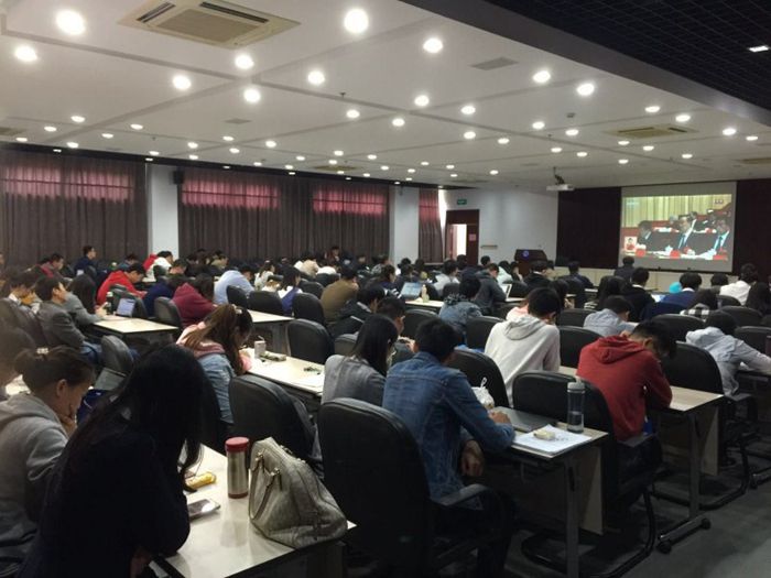 2017年10月18日上午,举世瞩目的中国共产党第十九次全国代表大会在北京人民大会堂隆重开幕。色情片 党委组织党政班子成员、支部书记、科室主任、学生党总支委员及学生党员骨干等在张江校区行政楼106报告厅集中收看“十九大”开幕盛况。全院15个党支部(包括教工、学生和退休党支部)通过电视、网络等媒体集体观看了现场直播。
