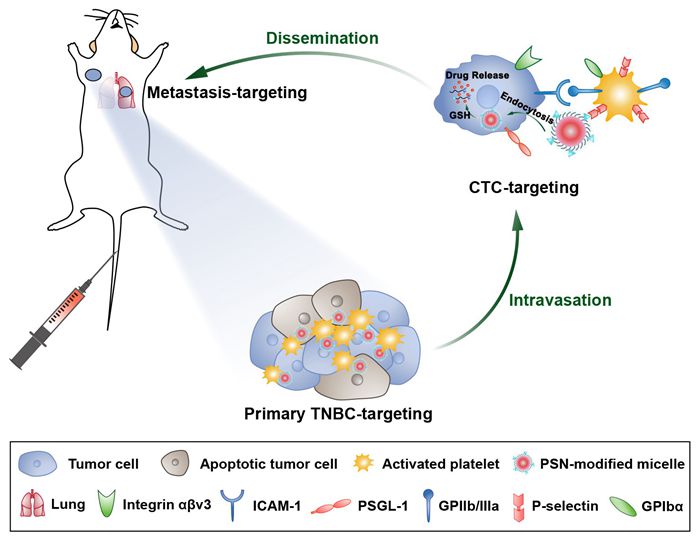 目前,治疗转移性TNBC的研究主要有两种策略:1)在传播前阻止高度侵袭性的循环肿瘤细胞 (CTCs,转移的“种子”)以防止转移的形成;2)靶向已形成的转移灶以杀死转移癌细胞并抑制肿瘤的过度生长。通常,载药纳米颗粒可以通过调控尺寸大小和针对肿瘤处特异性过表达受体来进行表面修饰以靶向肿瘤部位。然而,由于肿瘤的异质性,TNBC进展过程中存在分子表型的改变,靶向肿瘤细胞的纳米颗粒对CTCs和转移灶的特异性和靶向效率可能受到极大挑战。最近的研究表明,血小板可以通过细胞间粘附分子(ICAM)相互作用被肿瘤细胞募集和激活,帮助其进行血管内渗形成CTCs,随后激活的血小板聚集在CTCs周围形成“血小板-CTCs”聚集体并帮助侵袭性CTCs播散至远端器官。因此,针对激活血小板的这种特性,该研究设计并合成了一种P-选择素靶向肽(PSN)修饰的氧化还原响应型胶束,该胶束可以通过PSN与激活血小板膜表面高表达的P-选择素特异性结合,利用激活血小板对肿瘤转移过程的追踪作用,不仅可以在血液循环中捕获CTCs,还可追踪至转移灶或归巢到原发灶(图1)。该胶束在体内搭载激活的血小板,对原发TNBC及其转移灶的靶向性和穿透性显著增强,显著改善了TNBC原发瘤和肺转移的治疗效果。同时,该胶束可以清除循环中的CTCs,有效地抑制了肝转移的发生。该研究对转移性三阴性乳腺癌的全方位治疗提出了新的策略,具有良好的应用前景。