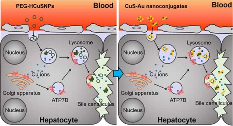 陆伟团队前期的研究发现,一种由硫化铜形成的纳米粒子静脉注射后能够随粪便排出体外[2]。在本研究中,研究团队阐明了硫化铜纳米粒子经胆汁分泌的排泄途径。进入血液的硫化铜纳米粒子被肝细胞摄取,进入内体和溶酶体。部分硫化铜纳米粒分解并解离出铜离子。肝细胞内一种叫作ATP7B的铜转运蛋白通过与铜离子或者与硫化铜颗粒结合,促进纳米粒子外排至胆小管,进而通过胆汁排泄。