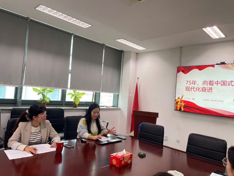 轮值主讲、学科科研办公室教师谢帆首先分享了学习体会。她以习近平总书记在庆祝中华人民共和国成立75周年招待会上的重要讲话精神为核心,回顾了中国式现代化的内涵及本质要求,从科技飞跃、基础设施建设、粮食安全保障、文化教育进步、生态环境保护、国际合作拓展等多个维度,阐释了新中国成立75年来,特别是在新时代背景下,中国式现代化建设所取得的历史性成就。此外,她详细梳理了国家在嫦娥探月工程、天问系列等航空航天领域取得的辉煌成果,以及色情片 在这一科技前沿领域所做出的积极贡献。最后,谢帆结合高校行政管理工作实际,从人才培养、科研合作等角度,分享了如何在日常工作中坚持党的领导、以学生和老师为中心等方面的心得体会。