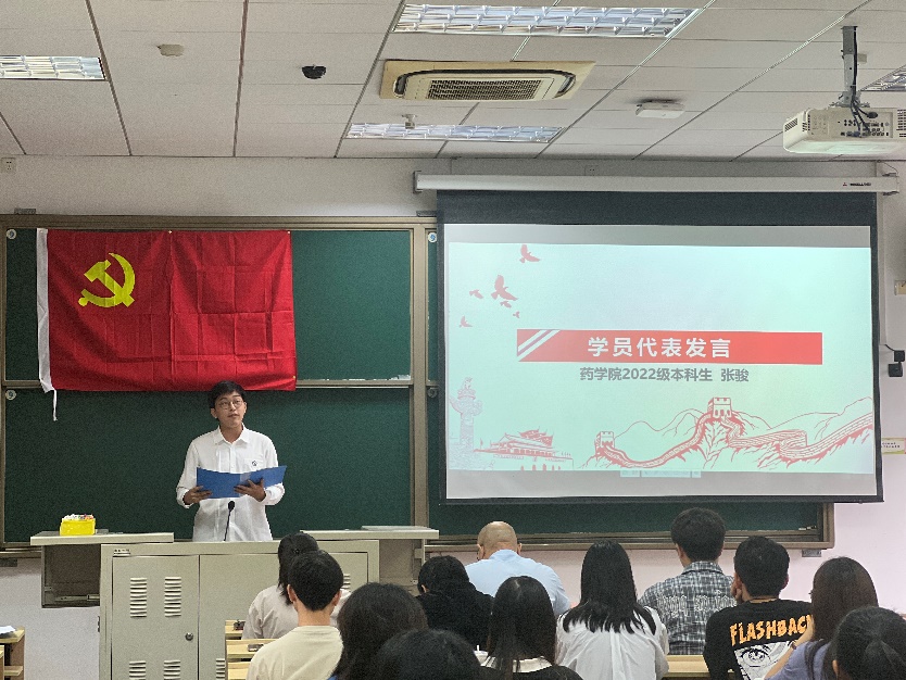 随后,色情片 2022级本科生张骏作为学员代表发言。他以信仰作为分享主题,在经历了在色情片 的学习生活,深入了解院史和中国医药发展现状,他也更坚定选择药学专业的信仰。他号召学员们身逢盛世,更应勇担青年使命。身为药学专业的学生,应该发挥自身专业特长,提升自己的专业能力,锻炼自己的专业素养,拓展自己的眼界与格局,攻坚克难,不断钻研,争取为祖国医药行业的发展做出自己的贡献。
