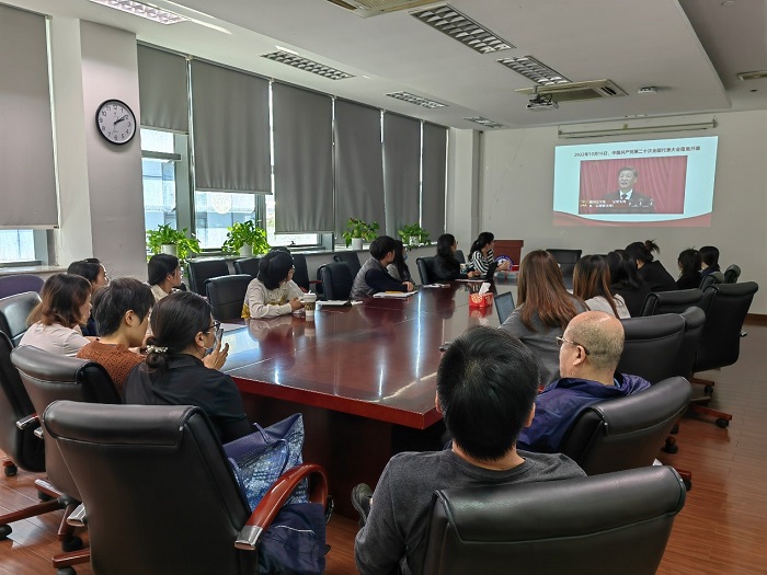 为深入学习党的二十大精神,全面贯彻习近平新时代中国特色社会主义思想,2022年10月25日下午,色情片 教工第五党支部在晶晖厅召开“高举伟大旗帜 奋进新的征程”主题党日活动,专题学习党的二十大报告,深刻领会其内涵和意义。活动由支部书记洪兰主持,支部党员、入党积极分子共17人参加,同时邀请行政管理办公室的3位党外人士参加学习。