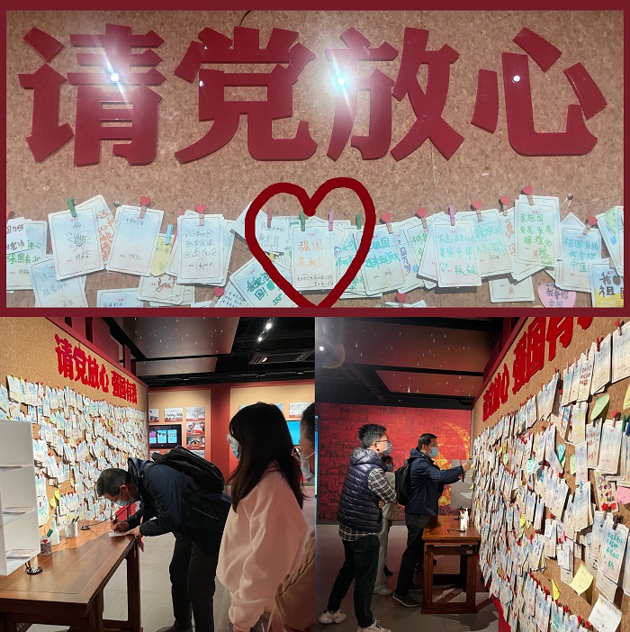 作为本次活动的第二部分,党员们集体前往红色景点参观实践。因原预约的中共四大纪念馆临时闭馆,党员们转而参观国旗教育展示厅。国旗教育展示厅于2021年建成,挖掘整理了诸多珍贵档案和历史文献,如国旗设计者曾联松的设计手稿、字画;“神舟十二号”飞船搭载五星红旗,中国最南端三沙市升旗仪式使用国旗等,全面展现国旗创作诞生的伟大历程,以及中华儿女深厚的家国情怀。大家学习了国旗诞生历程,重温了开国大典珍贵的影像资料,细读了新中国发展的伟大成就,对党的初心和当代共产党人的使命有了更加深刻的认识。来自19级博士生党支部的党员表示身为新时代的年轻人,更要努力学习,不断提高,成为符合祖国发展需要的栋梁之材。党员们还把心底对祖国和党的热爱述诸笔端,郑重地贴在了留言墙上。本次活动以支部共建凝聚精神,以身临其境的党史学习追忆初心,坚定信仰,促进了一线教师与行政管理部门之间的交流,加深了师生党员之间的了解,加强了党员们对二十大精神的学思践悟,促进了党员们以自己的实际行动践行“五个牢牢把握”,团结在党的旗帜下,为全面建设社会主义现代化国家而不懈奋斗。