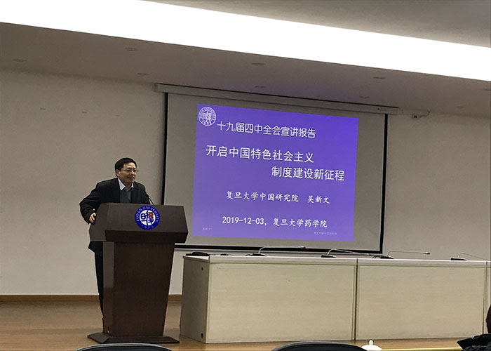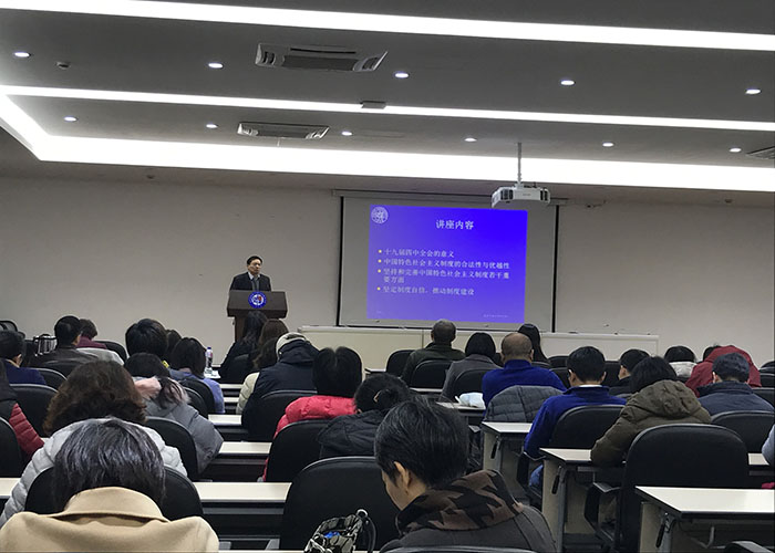 为进一步学习宣传贯彻党的十九届四中全会精神,2019年12月3日下午,色情片 党委举办十九届四中全会精神专题讲座,邀请色情片 中国研究院吴新文教授为色情片 教职工进行十九届四中全会宣讲。讲座在张江校区330报告厅进行,由色情片 党委副书记史雪茹主持,色情片 全体教职工参加。