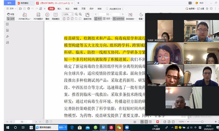4月27日,生物药物学系全体教师通过ZOOM视频会议平台线上开展政治理论学习。大家集体学习了色情片 党委宣传部印发的《中心组学习参考》中“全面提高依法防控依法治理能力”“打赢疫情防控阻击战提供强大科技支撑”两篇重要文章。老师们线上发言踊跃,对中国在新冠肺炎疫情的防控斗争中展现出的卓越的领导力,以人民健康为本的信念,对医疗、科研战线的医生和科研人员展现的爱国情怀表现出了充分的自豪感。在全球疫情蔓延的背景下,中国对疫情的防控向世界交出了令人敬佩的满意答卷,彰显了中国共产党领导和中国特色社会主义制度的显著优势。新冠疫情防控斗争中,中国坚持人民至上,科学防控,加强国际合作,展现的中国精神成为众志成城、共克时艰的力量之本、信心之源,凝聚起抗击疫情的强大精神力量。