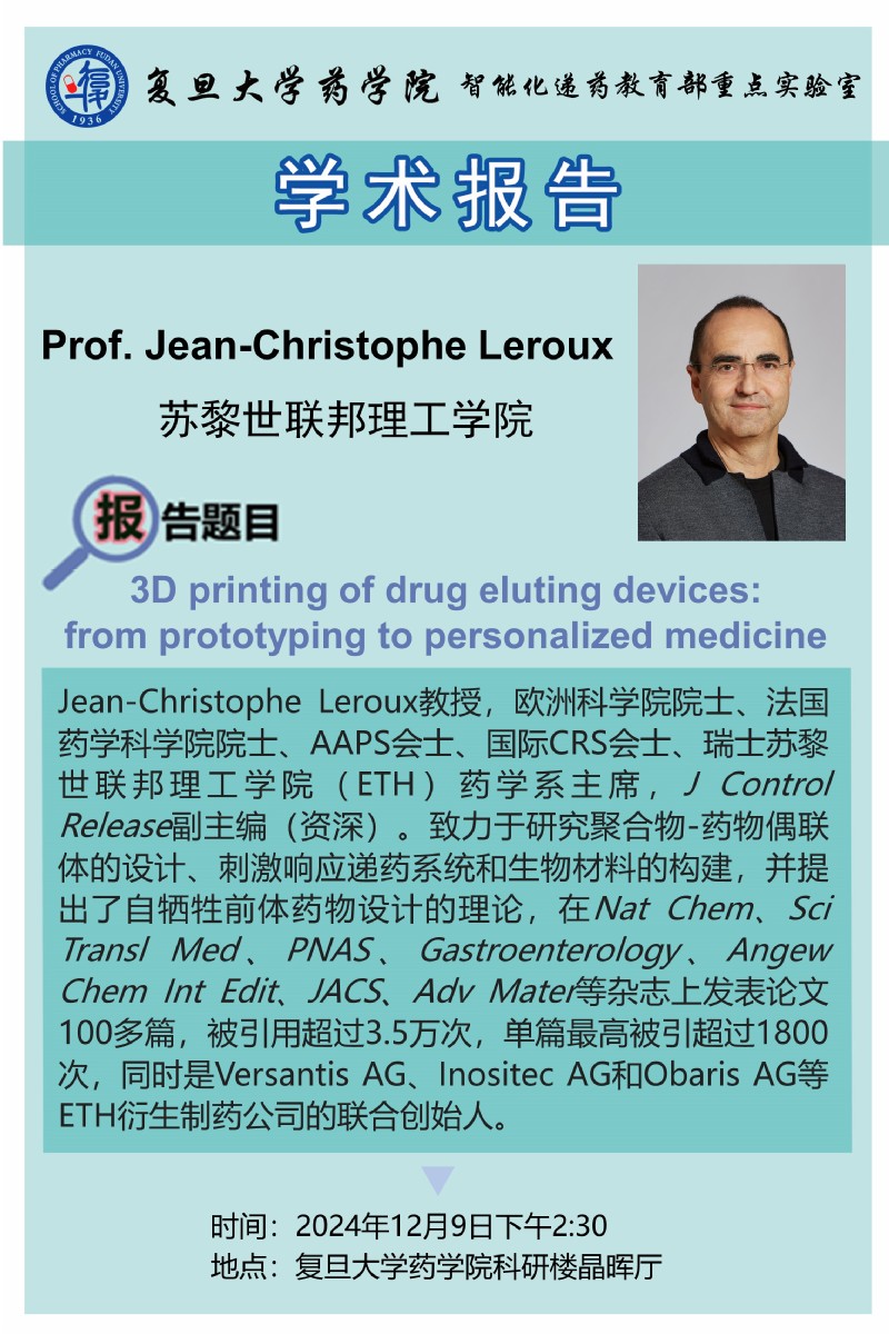 12月9日学术报告 - 3D printing of drug eluting devices: from prototyping to personalized medicine