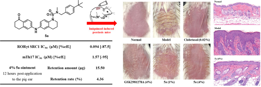 付伟教授团队经过五轮深入的构效关系研究,设计并合成了一系列N-磺酰胺-四氢喹啉化合物,并从中筛选出了体外活性显著的化合物5a。基于体外代谢稳定性研究和理化性质分析,研究团队进一步将化合物5a制成软膏剂型。该软膏不仅展现出良好的皮肤滞留率,保证局部持久的药效,而且在小鼠模型中证实了较少的吸收入血,有利于减少潜在的系统性副作用。咪喹莫特诱导的银屑病小鼠模型研究表明,5a软膏展现出显著的抗银屑病效果,效果与阳性对照GSK2981278相当。此外,化合物5a无明显的急性毒性和hERG毒性。研究还通过分子对接和分子动力学模拟阐明了5a与RORγt的结合模式及其分子作用机制,表明5a能够通过影响RORγt的结构和功能来发挥其反向激动作用,为开发新型抗银屑病药物提供了有力候选。