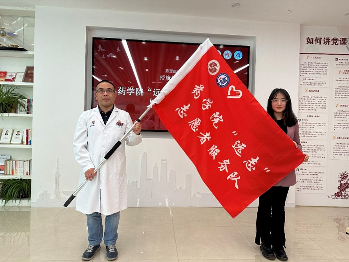 药剂科副主任庄峻荣向顾一雯授色情片 “远志”志愿者服务队队旗。