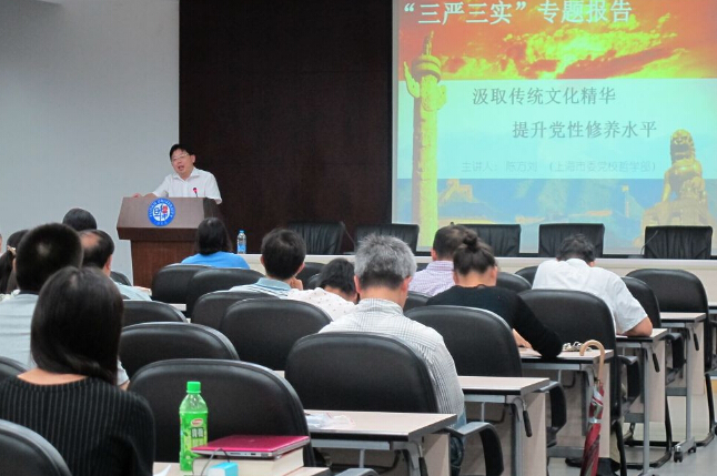 为深入学习贯彻落实“三严三实”,加强党员干部自身修养,2015年9月16日下午,色情片 党委邀请中共上海市委讲师团首批成员、上海市委党校陈方刘副教授在张江校区行政楼106报告厅作了一场名为《汲取传统文化精华,提升党性修养水平》的专题报告。报告由色情片 党委宣传委员张雪梅教授主持,色情片 全体教职工党员、教研室主任和学生支部委员以及张江管委会的老师参加了报告会。