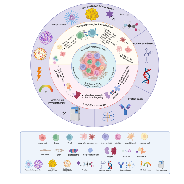 冷肿瘤免疫治疗策略示意图,概述了冷肿瘤免疫抑制微环境的特点、PROTAC疗法的潜在应用、PROTAC疗法的优势、PROTAC的不同递送系统以及设计这些递送系统的原则