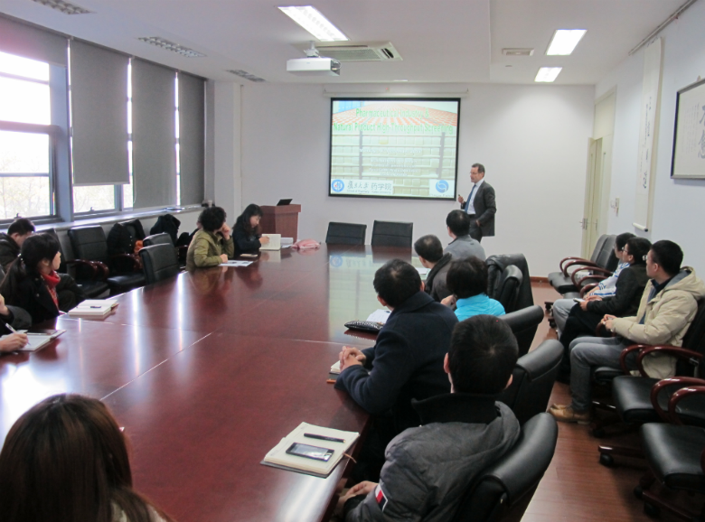 Dr. Bruno David from Pierre Fabre Laboratories (France) visited School of Pharmacy, Fudan University in the morning of December 14, 2015. He delivered a lecture entitled “Pharmaceutical industry and natural product drug discovery” and interacted face-to-face with a dozen of senior scientists at the school. Professor Ming-Wei Wang (Dean) warmly received Dr. David and Madam Aiyan Jiang (Pierre Fabre Beijing Office Director) in his office in the afternoon and asked the honorable guests to convey his sincere greetings to his old friend and Senior Vice President of Pierre Fabre Laboratories, Dr. Laurent Audoly.