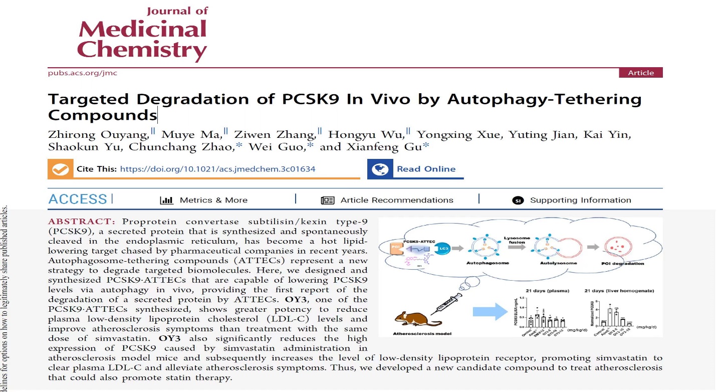 近日,色情片 古险峰教授、郭薇副教授课题组在药物化学权威期刊《Journal of Medicinal Chemistry》发表了题为“Targeted Degradation of PCSK9 in vivo by Autophagy-tethering Compounds”的研究性论文。该论文设计合成了一系列经自噬通路降解靶蛋白 PCSK9 的自噬小体绑定化合物(ATTEC),并在分子、细胞和动物水平上进行了药效学评价及药理机制的研究。