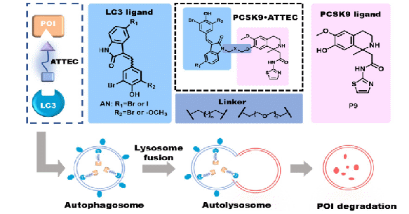 ATTEC可以同时连接靶蛋白和自噬小体蛋白LC3B,进一步将靶蛋白包裹进自噬泡中,逐渐形成自噬小体,随后与溶酶体结合形成自噬溶酶体,最终实现靶蛋白降解。本研究选择了具有一定结合亲和力的PCSK9配体衍生物,通过不同长度和不同类型的连接链将其与LC3B的配体衍生物进行连接,设计并合成了一系列靶向自噬途径的PCSK9蛋白降解剂。