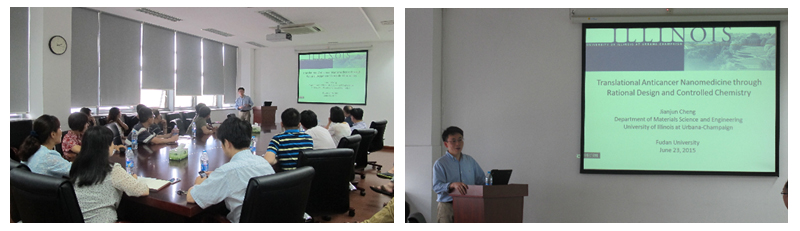 张江校区进行访问交流。访问期间,程教授为广大师生带来了精彩学术报告,报告题目为“Translational Anticancer Nanomedicinesthrough Controlled Chemistry”。广大师生通过学习交流,进一步了解了肿瘤发展发生的机制,拓展了肿瘤靶向的研究思路,丰富了肿瘤靶向的研究内容。同时,程教授与蒋晨课题组就合作研究及联合培养研究生项目,展开了深入讨论。此次学术交流对加强国内外药剂学界的合作与沟通具有积极意义。