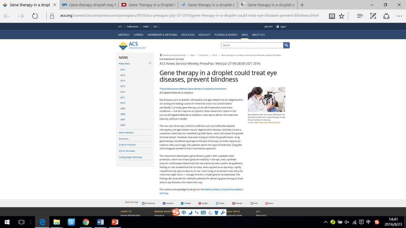 美国化学会在其网站上为该论文配发了题为《滴眼液能实现致盲性眼病的基因治疗》(“Gene therapy in a droplet could treat eye diseases, prevent blindness”)的新闻。该报道称魏刚等人的研究“开发了一种无须注射、通过局部给药将基因递送到眼内的新方法”。“糖尿病视网膜病变与老年黄斑变性等疾病发生于眼底,与血管内皮生长因子刺激血管异常生长有关。科学家们一直在尝试利用基因治疗抑制该因子的活性,但需要通过注射给药将基因递送到眼底。毫无疑问,很少有患者愿意接受这种治疗。魏刚和他的同事们试图找到一种非创伤性的给药方法,即利用一种名为Penetratin的多肽修饰质粒基因与树枝状大分子的复合物,通过简单的物理混合自组装形成基因递送系统。大鼠体内的评价结果表明,该递送系统滴注眼表后迅速分布至眼底,并在视网膜部位滞留8小时以上,为模型基因的表达提供了充足的时间。”ACS的资深科技资讯主任评价道:“致盲性的眼部疾病难以治疗,但新的滴眼给药治疗策略正展露曙光。”