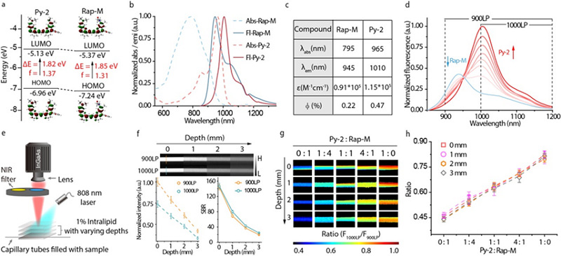 为了评估设计策略的可行性,作者首先进行了量子化学理论计算。结果表明,Py-2和酰化后的分子Rap-M具有近似的能隙和振子强度f值,表明它们可能具有不同的吸收光谱但具有类似的发射光谱性质,有潜力开发成比率荧光探针。进一步合成Py-2和Rap-M并测试发现他们的最大吸收和发射波长分别为965/1010 nm和795/945 nm。作者进一步通过调节Py-2和Rap-M之间的比例来模拟比率荧光信号。使用实验室自己搭建的InGaAs装置,采集不同深度(1%Intralipid)下这些混合物溶液的900 LP和1000 LP荧光,定量分析结果表明,这两个通道的荧光信号衰减与穿透深度的增加同步,不同深度得出的比值保持稳定,表明在不同的穿透深度下比率信号是可靠的(图2)。