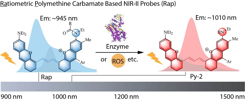 近红外二区(NIR-II, 1000-1700 nm)荧光成像因其具有良好的组织穿透能力和实时动态高分辨率等优点,可以在亚毫秒至微秒的时间尺度内活体动态监测肿瘤微环境。目前NIR-II 区的荧光探针主要是 “关-开”型探针,此类型荧光探针可以选择性被活体内的特定底物激活,从而给出信号,但它们只能实现“有”和“无”的信号改变,利用“关-开”型荧光探针可以实现对肿瘤微环境中特定底物如酶、 ROS/RNS定性的可视化监测,但不能实现定量变化的监测。相比而言,比率型荧光探针由于可以通过多个通道采集信号再把各通道信号进行关联,具有自我校正功能,可以实现定量分析监测。但截至目前为止,NIR-II区比率荧光探针和探针设计策略都比较少,且能实现检测的底物种类以强氧化性物质为主,不能满足对酶等生物分子的检测需求。基于此,色情片 雷祖海青年研究员团队开发了一种用于构建第二近红外窗口比率型分子荧光探针的聚甲炔分子平台Py-2,可实现对活体深层组织内酶、ROS/RNS等生物分子的可视化量化监测(图1)。