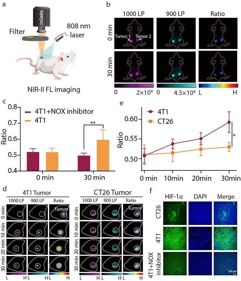 鉴于Rap-N探针在体外测试的高灵敏度和特异性,作者进一步研究了Rap-N实时显示体内NTR活性的能力(图4)。选择携带两个皮下4T1乳腺肿瘤的雌性BALB/c小鼠作为模型。作为对照,一侧4T1肿瘤部位用NTR抑制剂双香豆素(肿瘤1)预处理,其荧光信号比(F1000LP/F900LP)约为0.5,在双香豆素组(肿瘤1)中保持不变,另一侧在30分钟内(肿瘤2)达到约0.6,这些结果表明,Rap-N在肿瘤中可被NTR选择性激活。进一步比较不同肿瘤中的NTR活性,作者选择CT-26结肠肿瘤作为另一种肿瘤。4T1肿瘤中的比率荧光信号 (∼0.59)明显高于CT-26肿瘤(∼0.53),结果显示4T1肿瘤表现出比CT-26肿瘤更高的乏氧,免疫荧光染色结果也表明4T1肿瘤比CT26肿瘤更缺氧,双香豆醇可以有效抑制NTR的活性。