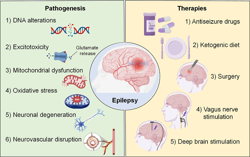 图1. 癫痫常见发病机理及临床治疗策略。