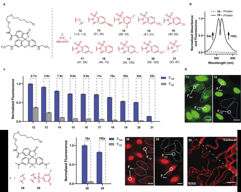基于罗丹明500R染料,引入不同苯磺酰胺结构,精确调节开闭环结构的平衡,进而调节细胞内目标蛋白和背景荧光信号的相对比值,实现免洗条件下活细胞内高信噪比成像(图2)。