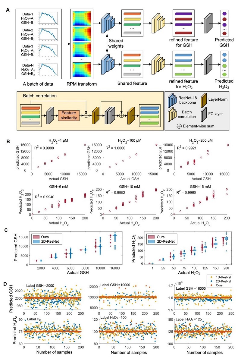 图3. 深度学习模型DBCNet同步测定GSH和H₂O₂。(A)DBCNet算法原理示意图。 (B)DBCNet预测GSH(或H₂O₂)浓度的线性回归图(测试集包含三种不同浓度的H₂O₂或GSH)。(C)2D-ResNet与DBCNet预测GSH和H₂O₂浓度的箱线图对比。(D)1D-ResNet、2D-ResNet和DBCNet三种模型预测浓度的散点分布比较。