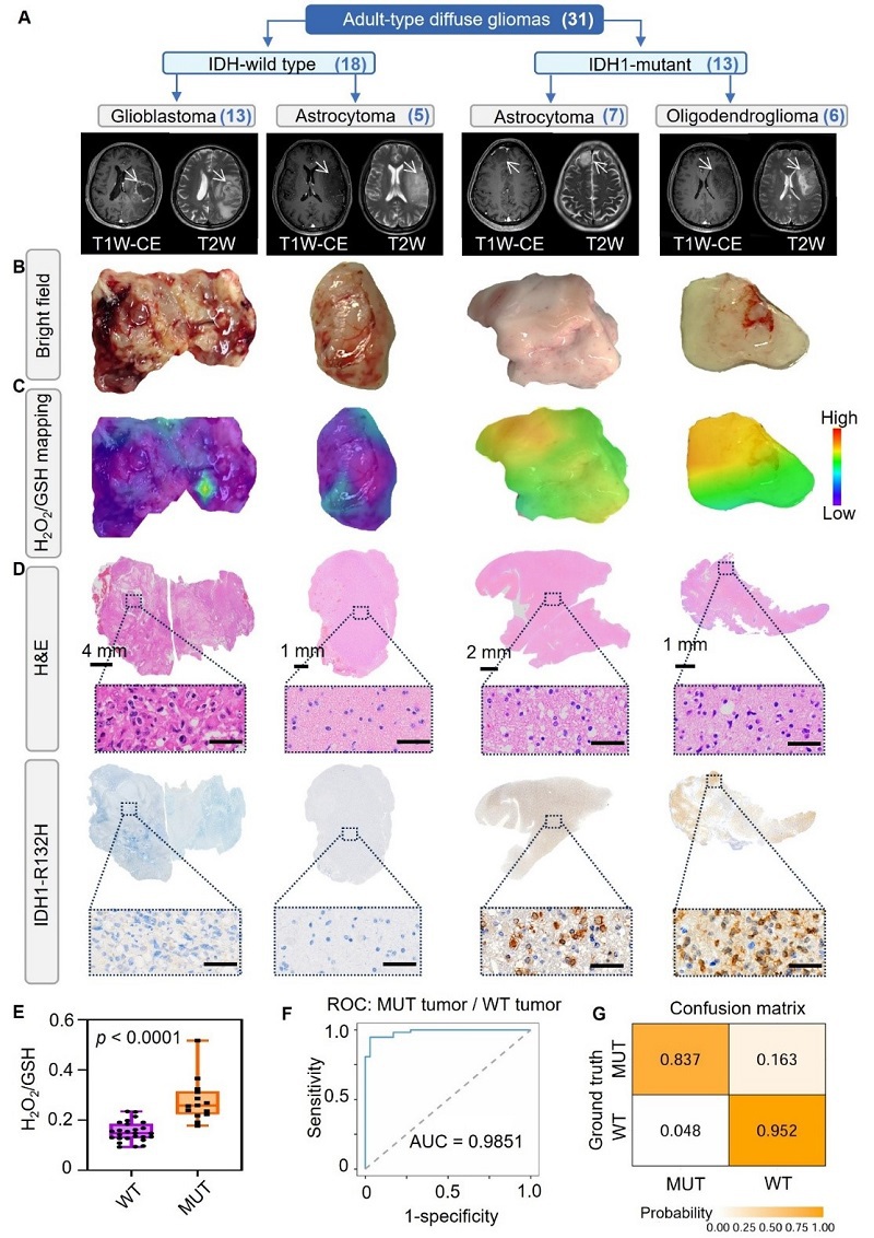 图4. Au-R12P在术中鉴别患者胶质瘤IDH1基因型。(A)世界卫生组织第五版中枢神经系统肿瘤分类与各类胶质瘤的典型T1加权增强(T1W-CE)和T2加权(T2W)磁共振影像。(B)上述各类新鲜切除的胶质瘤组织标本明场照片。(C)切除肿瘤组织的H₂O₂/GSH比率分布图,通过多点采样计算I542/I928(GSH)和I628/I928(H₂O₂)拉曼峰强比生成。(D)图B所示肿瘤组织的H&E染色和IDH1-R132H免疫组化结果(放大图比例尺:40μm)。(E)IDH1野生型(WT)与突变型(MUT)胶质瘤组织的平均H₂O₂/GSH比值比较。(F)基于H₂O₂/GSH比值的逻辑回归模型ROC曲线,用于临床IDH1-WT/MUT分型。(G)两种胶质瘤亚型的混淆矩阵。
