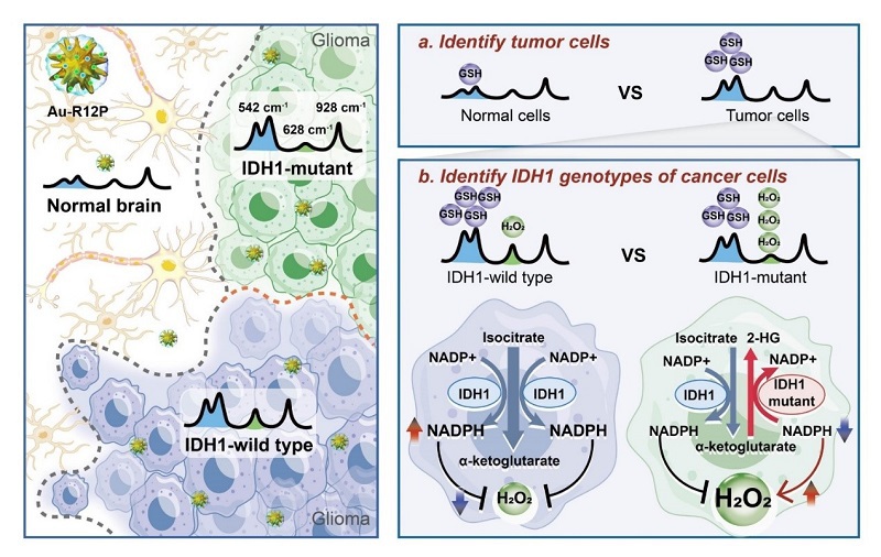 胶质瘤作为最常见恶性脑部原位脑瘤,手术切除是首选治疗手段。由于胶质瘤细胞脑内侵袭的复杂性和异质性,精准界定肿瘤边界面临挑战。不完整切成造成恶性组织残留导致肿瘤快速复发,而过度切除则可能造成脑神经功能损伤。2021年世界卫生组织(WHO)第五版中枢神经系统肿瘤分类指南将分子特征作为胶质瘤分类标准,其中异柠檬酸脱氢酶1(isocitrate dehydrogenase 1, IDH1)基因成为分子分型的核心指标。IDH1是三羧酸循环关键限速酶,其突变型(R132H等)会产生致癌代谢物D-2-羟基戊二酸(D-2HG),其干扰DNA和组蛋白去甲基化过程,导致细胞表观遗传程序紊乱,促进肿瘤细胞去分化与增殖。IDH1快速分型对提高手术预后具有临床意义。IDH1野生型肿瘤通常对术后放化疗响应不佳,临床推荐尽可能安全切除;而IDH突变型则对放化疗响应较好,建议在保留神经功能前提下精准切除。因此,术中IDH1快速分型对优化胶质瘤手术策略,提高手术预后具有重要意义。