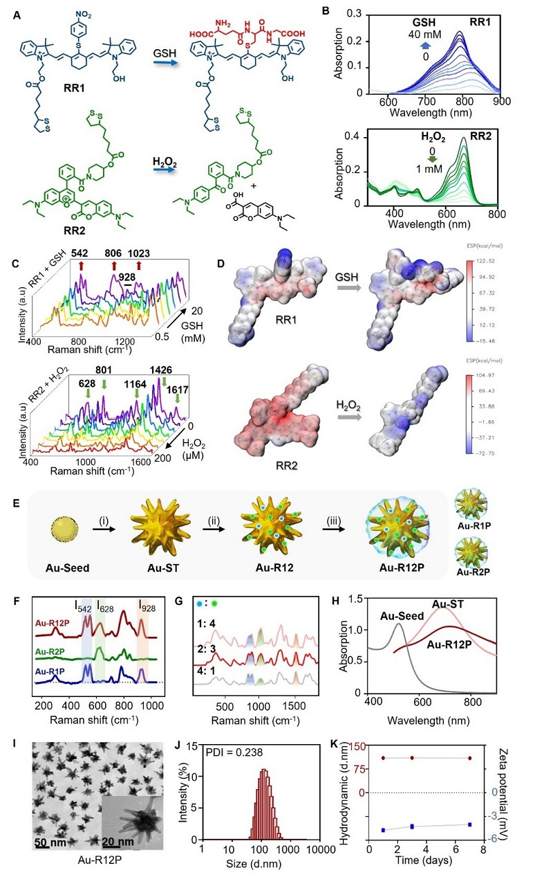 图2. SERS探针Au-R12P的合成与表征。(A)分别响应GSH和H₂O₂的拉曼分子报告基团RR1和RR2的化学结构。(B)RR1和RR2的吸光度随GSH和H₂O₂浓度变化曲线。(C)RR1的GSH依赖性SERS光谱和RR2的H₂O₂依赖性SERS光谱。(D)RR1和RR2分子在GSH/H₂O₂处理前后的静电势(ESP)分布图。(E)Au-R12P合成流程:(i)抗坏血酸/AgNO₃反应40秒(室温);(ii)RR1/RR2修饰1小时(室温);(iii)HS-PEG5k-OCH3孵育12小时(室温)。当步骤(ii)仅添加RR1或RR2时,可分别获得对照探针Au-R1P或Au-R2P。(F)785nm激发下Au-R12P与对照探针的拉曼光谱,可见I542(GSH响应峰)、I628(H₂O₂响应峰)和I928(内参比峰)的完全分离。(G)不同RR1:RR2摩尔比修饰的Au-R12P拉曼光谱。(H)金纳米晶、金纳米星和Au-R12P的水溶液吸收光谱。(I)Au-R12P的透射电镜图(标尺:50nm),插图为局部放大图(标尺:20nm)。(J)Au-R12P的粒径分布及PDI变化。(K)Au-R12P在水溶液中的流体力学直径和ζ电位随时间变化曲线。