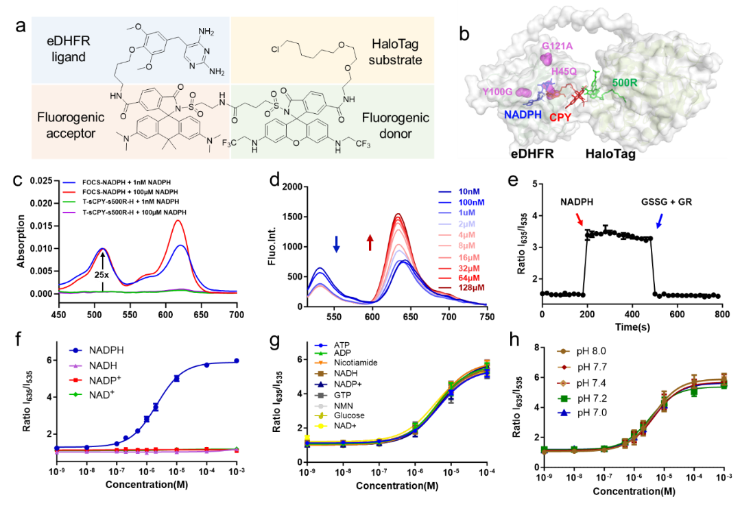 在本项工作中,王璐课题组基于蛋白响应型荧光染料构建了新一代化学遗传编码探针(FOCS Fluorogenic rhodamine-based Chemigenetic biosensor),包括小分子化学探针和标签/识别蛋白(图1b)。小分子探针由绿色供体染料和红色受体染料构成,游离状态下无荧光。探针与标签蛋白结合后发射绿色荧光;而NADPH会促进小分子探针与识别蛋白结合,发射红色荧光,通过红/绿色比值实现NADPH的比率检测。两种染料通过一步标记1:1结合到融合蛋白标签上,可实现免洗标记并产生高特异性的FRET比率荧光信号。