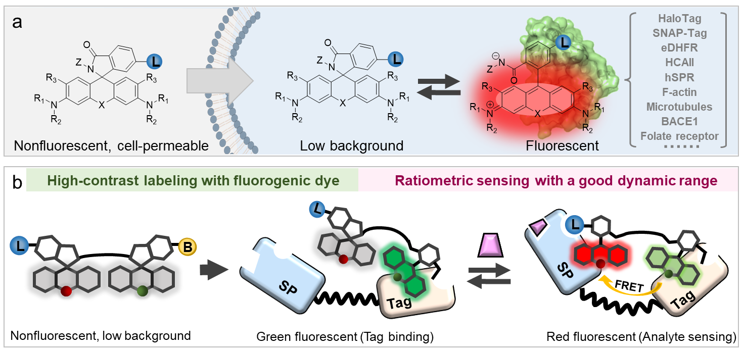 王璐课题组前期工作中开发了一类蛋白响应型荧光探针,其在游离状态下无荧光且脂溶性强,能够快速跨膜并在细胞内保持低背景信号。当该探针与目标蛋白(如HaloTag、SNAP-tag、微管蛋白和F-actin等)结合后,染料结构从“闭环”转变为“开环”,导致荧光信号增强可达数百倍(图1a)(Nat Chem 2020, Nat Comm 2022, Angew Chem Int Ed 2021),实现了活细胞内高信噪比的靶标蛋白免洗成像。