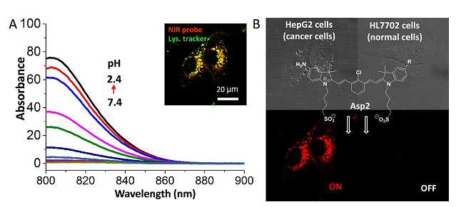 (A) 溶酶体pH敏感近红外荧光探针发射图谱;(B) pH敏感荧光探针选择性示踪肿瘤细胞