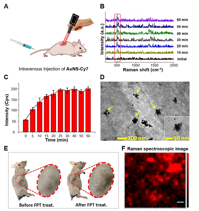图3. 手持式拉曼成像仪无创观察皮下瘤模型。(A)无创肿瘤SERS成像示意图;(B)施加光透剂后肿瘤区域随时间变化的SERS光谱;(C)施加光透剂后肿瘤区域随时间变化的SERS信号强度;(D)TEM图揭示探针肿瘤内存在;(E)肿瘤区域施加光透剂前后白光示意图;(F)肿瘤切片拉曼显微镜成像。