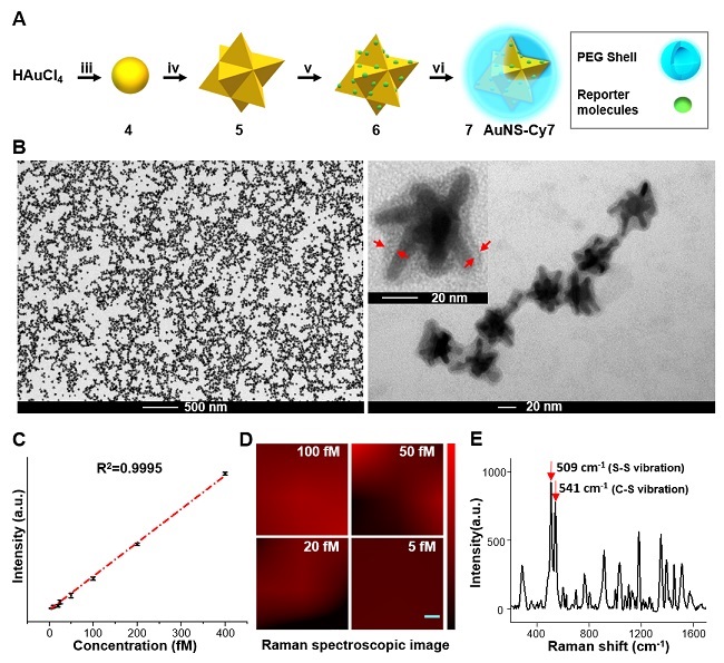 图2. 超灵敏SERS探针的合成和表征。(A)拉曼探针合成示意图;(B)拉曼探针TEM示意图;(C?D)探针信号强度随浓度变化示意图;(E)拉曼探针特征光谱图。