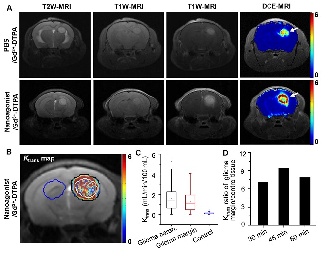 图2. 纳米激动剂增加胶质瘤浸润边缘血脑屏障通透性。(A)胶质瘤原位移植裸鼠使用Gd3+-DTPA(上排)处理或Den-RGD-Reg和Gd3+-DTPA联合(下排)处理后的T2W-MR、T1W-MR和DCE-MR图像。(B)Den-RGD-Reg处理后小鼠脑部的Ktrans图。注射纳米激动剂45 min后再注射Gd3+-DTPA,白线圈出区域为肿瘤实质部分,白线圈和黑线圈之间为肿瘤边缘,蓝线圈出区域为对照脑组织。(C)注射纳米激动剂后,胶质瘤实质、胶质瘤边缘和对照脑组织的平均Ktrans值。(D)注射纳米激动剂30 min、45 min、60 min后在胶质瘤边缘和对照脑组织间的Ktrans比值。