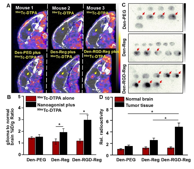 图3. 纳米激动剂增加胶质瘤对模型药物的摄取。(A)静脉注射99mTc-DTPA后小鼠脑部的活体SPECT/CT成像(上排)。Den-PEG和99mTc-DTPA联合给药(组1)、Den-Reg和99mTc-DTPA联合给药(组2)以及Den-RGD-Reg和99mTc-DTPA联合给药(组3)的小鼠脑部的体内SPECT/CT成像(下排)。99mTc-DTPA为模型药物,在注射纳米激动剂45 min后注射。(B)注射Den-PEG、Den-Reg或Den-RGD-Reg 45min后,注射99mTc-DTPA (3.7 ×106 Bq/鼠),胶质瘤与正常脑组织的%ID/g比值。(C)注射99mTc-DTPA 90 min后,裸鼠脑部切片的放射自显影图像,箭头指胶质瘤组织。(D)放射性自显影图像中正常脑组织和胶质瘤区域中99mTc-DTPA的相对放射性强度。