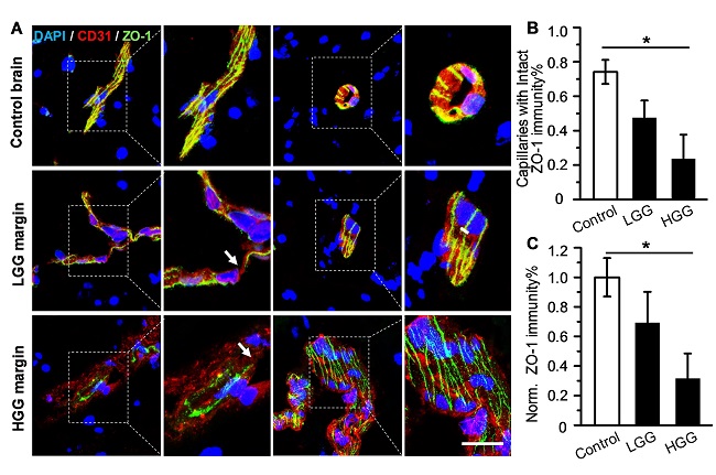 图1.不同恶性疾病胶质瘤患者肿瘤浸润边缘血脑屏障局部完整。(A)对照脑组织、低级别和高级别胶质瘤边缘部位的血管内皮细胞和ZO-1蛋白的免疫荧光染色图像。CD31抗体标记发的血管内皮细胞显示为红色,ZO-1蛋白为绿色;DAPI染色的细胞核显示为蓝色。比例尺:30 μm。(B)对照脑组织和胶质瘤边缘组织中,具有完整紧密连接蛋白的毛细血管所占百分比。(C)对照脑组织和胶质瘤边缘血管ZO-1蛋白的免疫荧光强度。LGG:低级别胶质瘤;HGG:高级别胶质瘤。