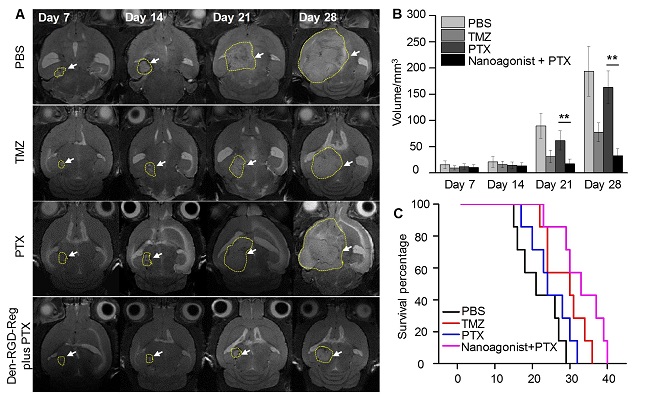图4. 影像引导的血脑屏障通透性调控和药物递送策略提高胶质瘤化疗效果。(A)使用PBS、TMZ、PTX、纳米激动剂和PTX联合治疗后,荷胶质瘤裸鼠脑部活体T2W-MR图像。各治疗组荷胶质瘤裸鼠的肿瘤大小(B)和存活率(C)随时间变化。PTX:紫杉醇,TMZ:替莫唑胺。